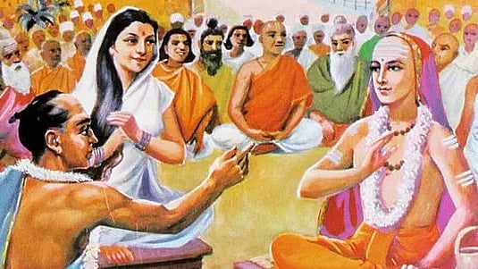 Mandana Mishra and Bharati Devi were ideal householders and followed the Purva Mimamsa teachings perfectly. Their house was big enough to host fifty people, and they fed hundreds of needy people every day. They created wealth and made a positive contribution to society. They had many children and grandchildren and lived an ideal life as described in the Purva Mimamsa philosophy. They conducted large-scale havans (fire rituals) as described in the Vedas, and the gods blessed them with prosperity and means to serve society. Mandana Mishra was a little disdainful of Sanyasis. He thought they burdened society, whereas he created wealth and served the community.